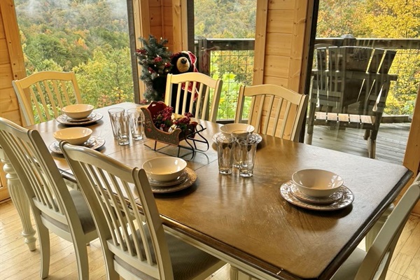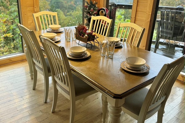 Share meals surrounded by golden cabin glow and scenic views beyond the windows. Every breakfast, dinner, or toast feels a little more special in this inviting space.