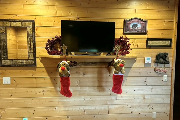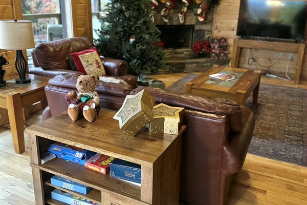 Cozy up by the crackling fireplace beside a beautifully decorated Christmas tree, where twinkling lights and stockings bring the cabin’s holiday spirit to life.